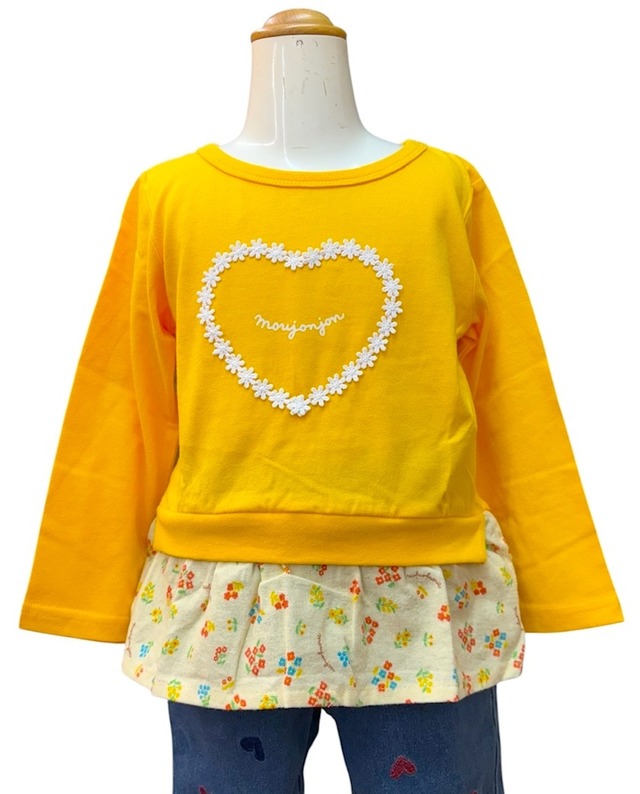 Moujonjon ムージョン★花柄のハート 切り替え 天竺 長袖Tシャツ